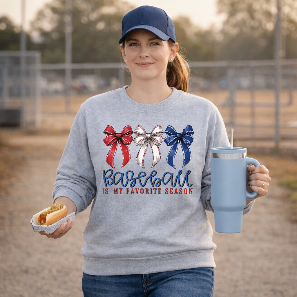 Our “Baseball Is My Favorite Season” Patriotic Bows Transfer is the perfect mix of sweet and sporty. Featuring three beautifully detailed bows with subtle baseball stitching in classic red, white, and blue, this design brings a fun, feminine twist to game day style.