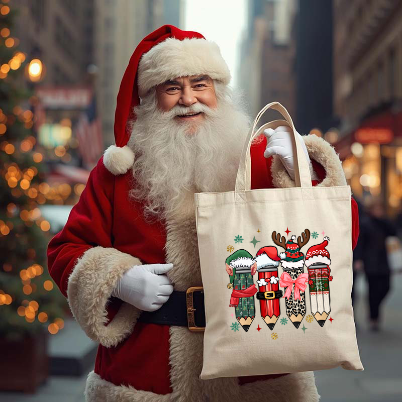 Cute, festive, and absolutely teacher-approved — this Christmas Pencil Stack transfer is the perfect holiday design for educators who love to get into the spirit! Each pencil is dressed in its own Christmas outfit: elf ears and plaid scarf, Santa belt, cozy fair isle knits, a leopard-print bow, and even a reindeer topper complete with antlers.