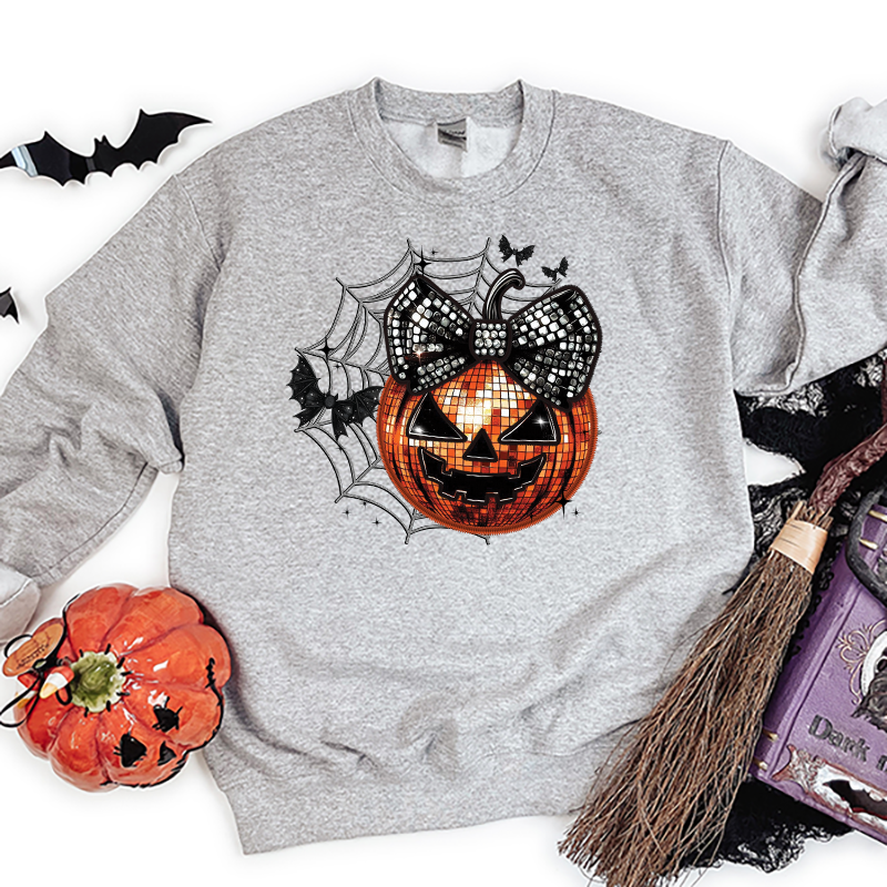Turn up the boo-gie this Halloween with a pumpkin that knows how to party! This dazzling jack-o’-lantern shines like a disco ball, topped with a sparkling bow and surrounded by webs and bats for just the right mix of spooky and stylish.