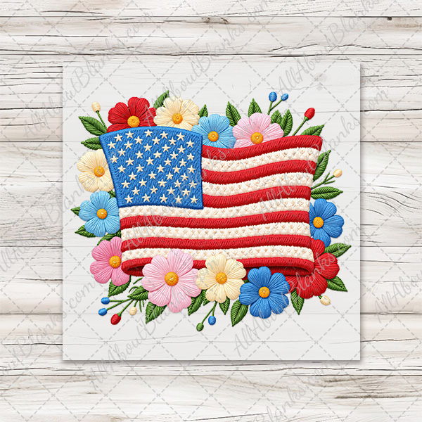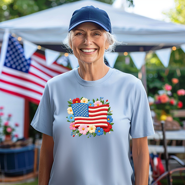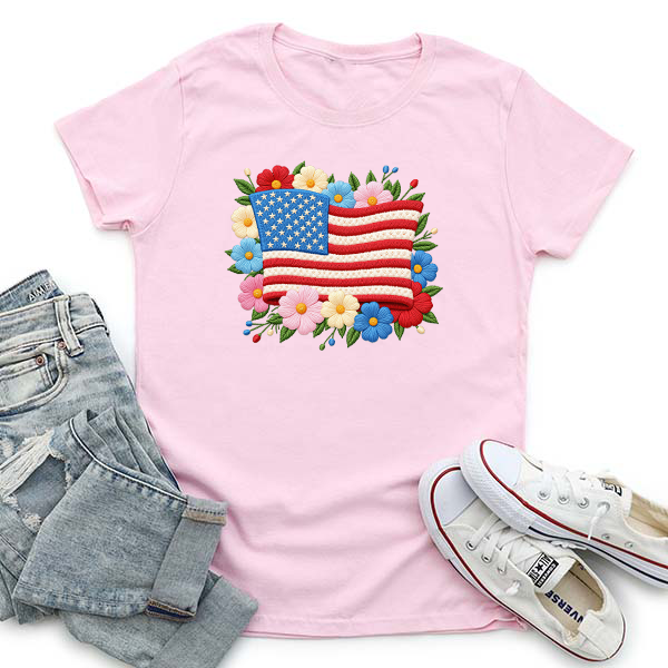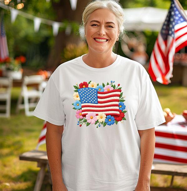 Floral American Flag Faux Embroidery Transfer - T-SHIRT SIZE