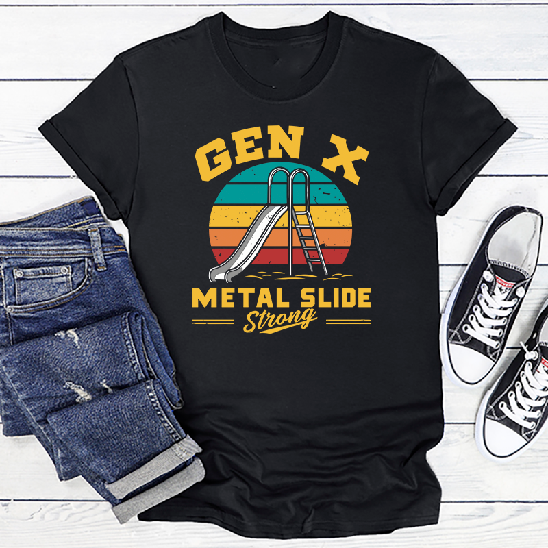 The Gen X – Metal Slide Strong transfer is a hilarious nod to childhoods spent on blazing hot metal playground equipment with zero supervision and maximum character building.
