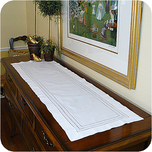 Our most popular tablerunner! Now available in 4 lengths to suit all of your embroidery needs! It is made of 100% Linen and has a combination gilucci and hemstitched detailed border. It's very simple, yet elegant!