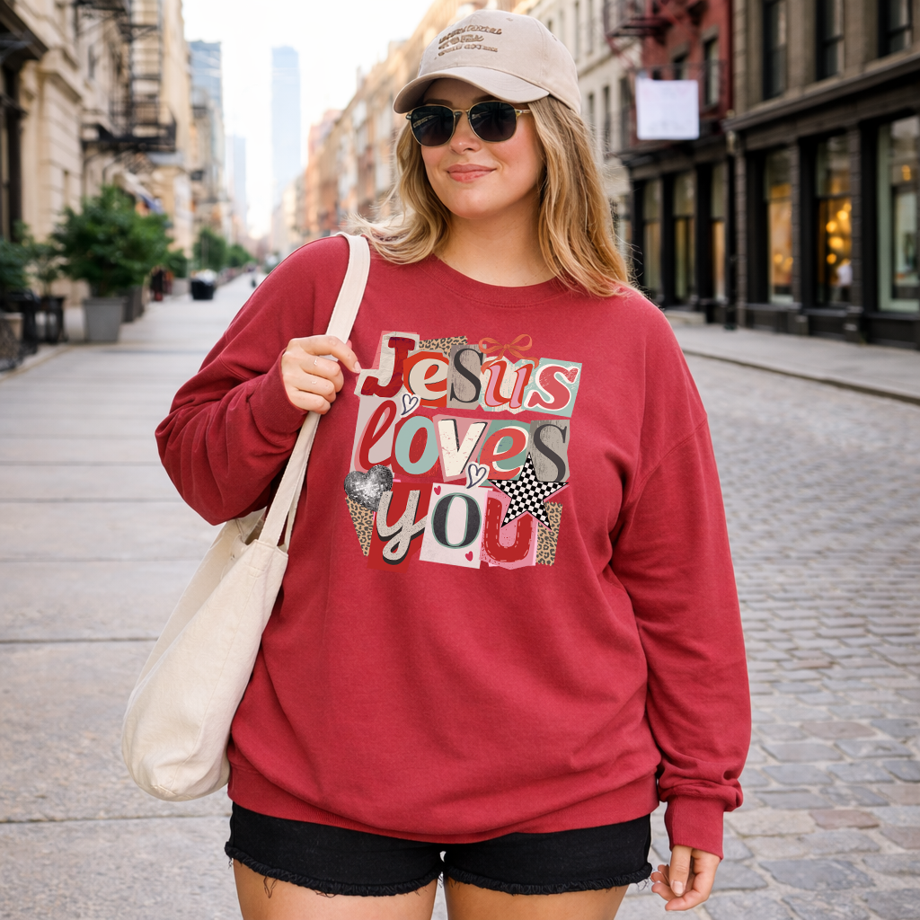 [message]A heartfelt message with a fun, retro twist. This collage-style “Jesus Loves You” design features cutout lettering, mixed textures, and sweet Valentine details—perfect for spreading love and faith all season long.
