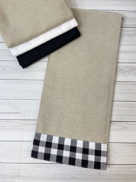 We took our beautiful and rich oatmeal kitchen towel fabric and added a farmhouse-feel buffalo check border to the bottom! It's a great towel for both everyday and holidays!