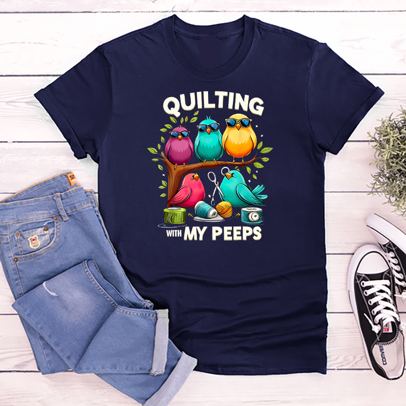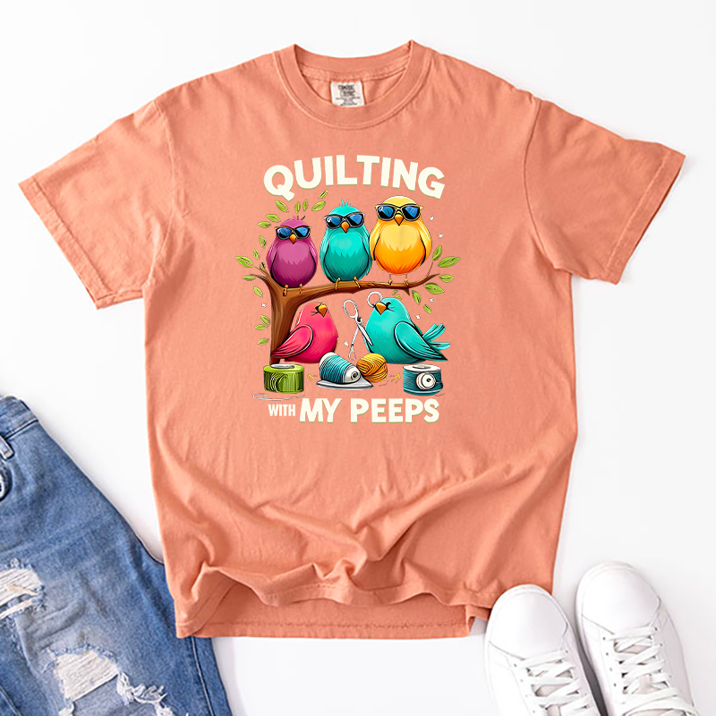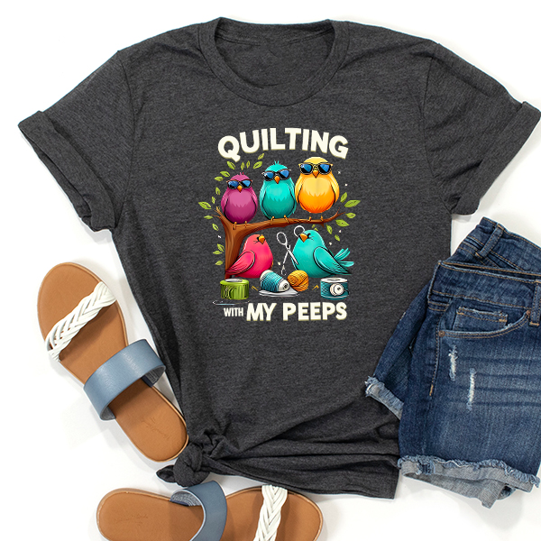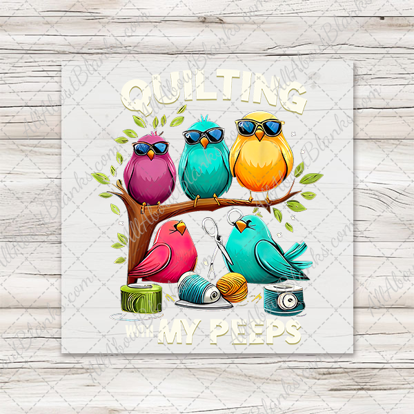 Bring your quilting crew together in style with our Quilting With My Peeps Transfer! Featuring a flock of colorful, sunglasses-wearing birds perched on a branch, this design is as cheerful and social as your favorite quilting day. Perfect for group tees, retreat apparel, or tote bags, this one’s a guaranteed hit with your quilting “peeps.”