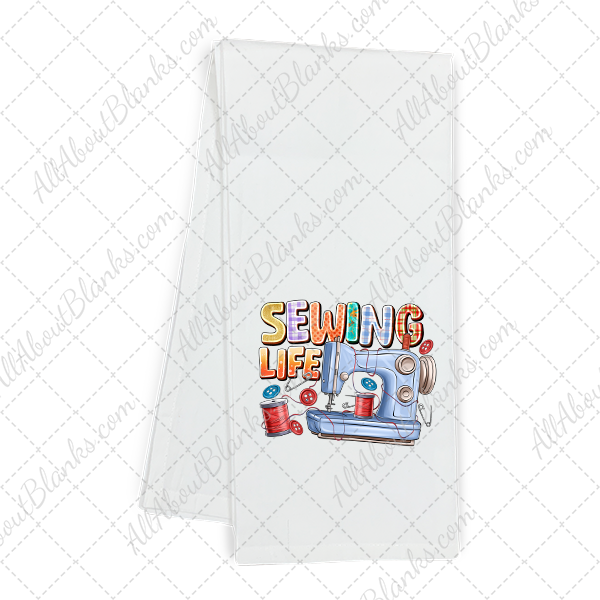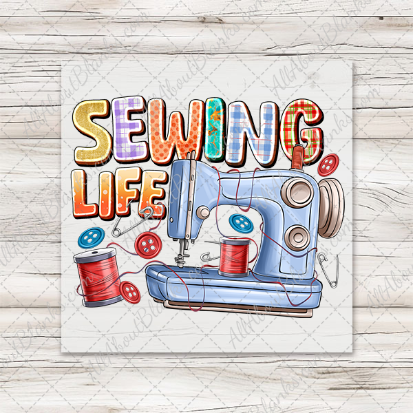Our Sewing Life transfer is a vibrant collage of crafty goodness, featuring a classic sewing machine surrounded by spools of red thread, buttons, pins, and playful patchwork-style lettering. Each detail pops with color and personality, making it the perfect piece for anyone who lives the creative life one stitch at a time.