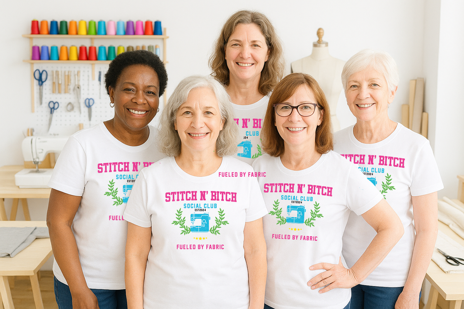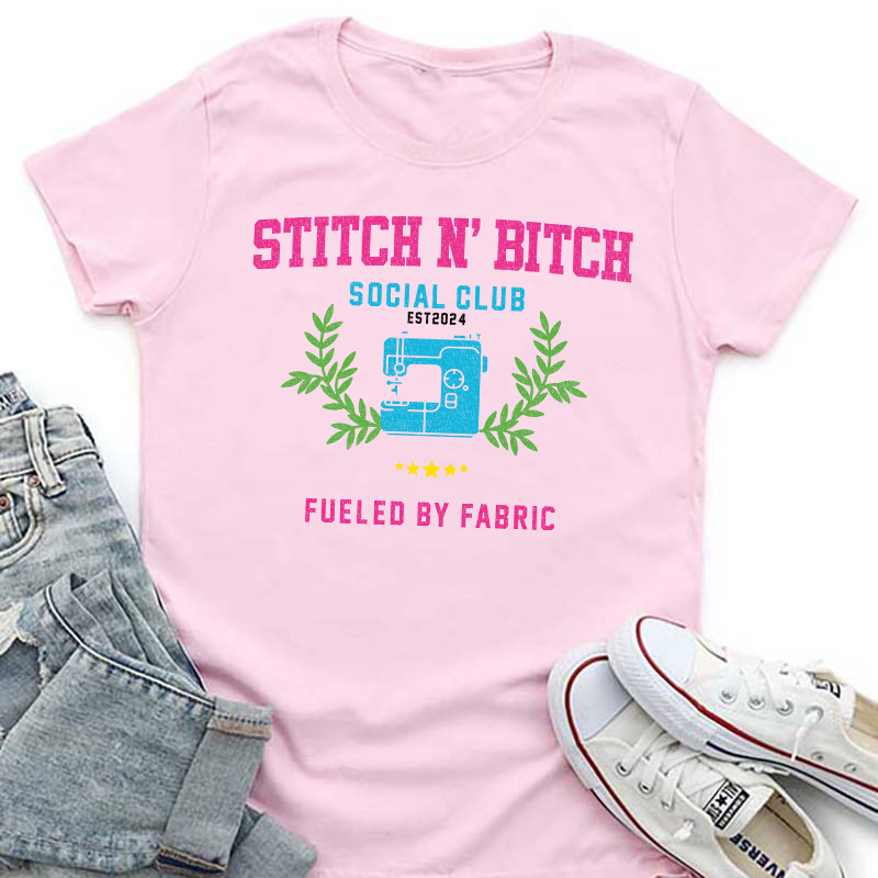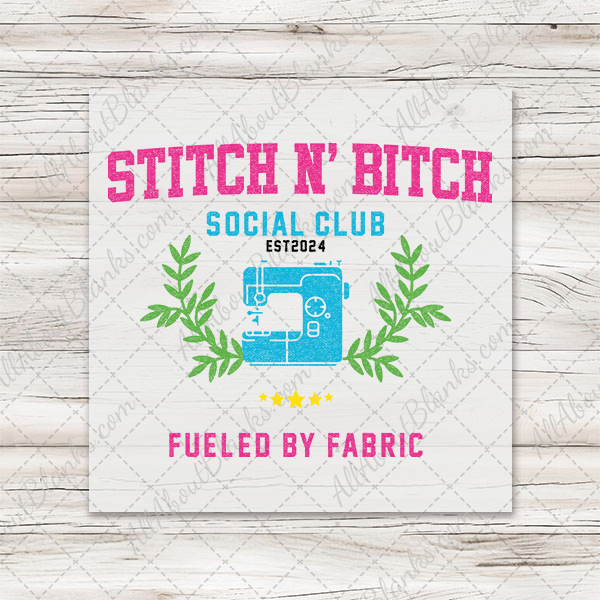 Make your next sewing night unforgettable with our Stitch N’ Bitch Social Club Transfer! A perfect mix of sass and style, this design celebrates sewing friends who know how to have fun (and maybe vent a little while they stitch!). Featuring a vintage-inspired sewing machine surrounded by greenery and stars, it’s ideal for crafting group tees, totes, or even aprons. Whether your crew is “fueled by fabric” or fueled by laughter, this design will have everyone talking.