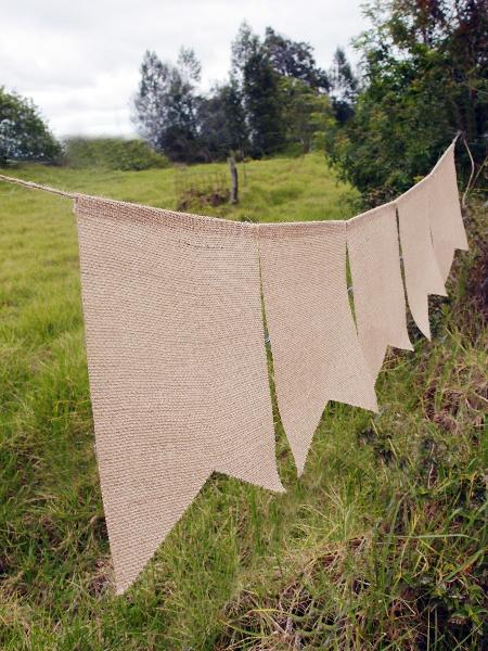 Each banner flag is 8" wide x 10" tall. Each package contains 5 individual banner flags with 15" jute cord ties on each end. Easily add more flags to your banner by slipping onto the jute cording. The banner is made with 100% natural jute with a fusible web backing on one side.