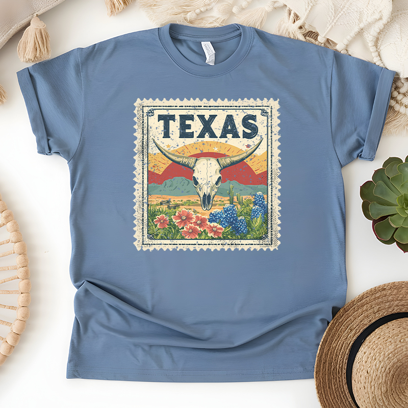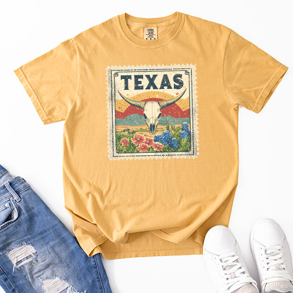 Straight out of a well-traveled postcard collection, this vintage-inspired Texas design delivers rustic charm with a side of wildflower beauty. Featuring a longhorn skull, bluebonnets, and a desert sunset, it’s framed like an old postage stamp—because Texas pride is worth sending out to the world. Looks especially sharp on Comfort Colors Washed Denim and Mustard tees for that perfectly worn-in vibe. Ideal for everyday wear, spring markets, or just showing off your Texas roots in retro style.