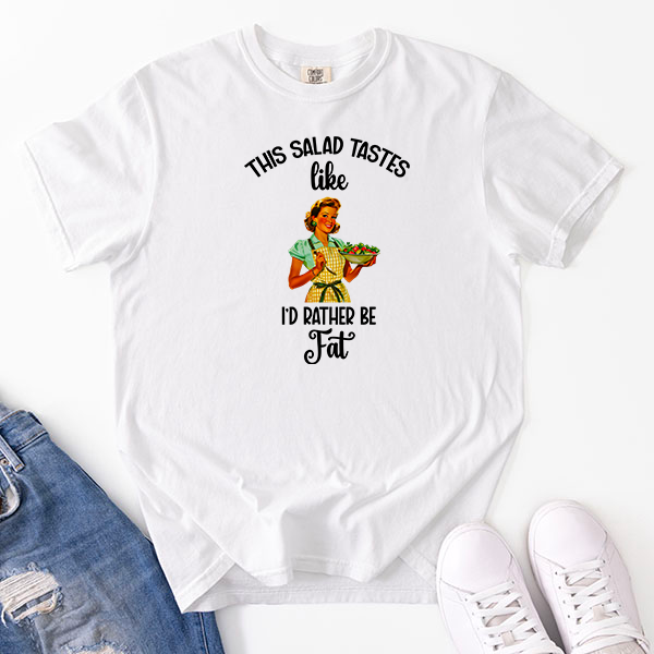 Introducing the transfer that speaks the leafy truth! Straight outta the 1950s and fresh into your sassiest project yet, this design features a picture-perfect vintage housewife holding a salad... with the deadpan glare of someone who knows she deserves carbs.